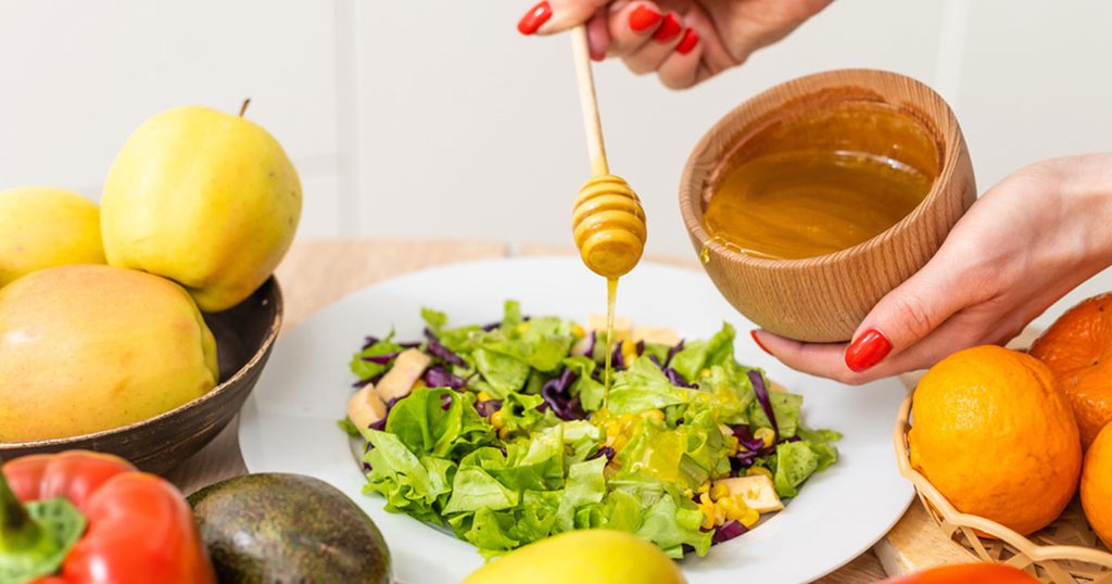 يعتبر العسل من المحليات الطبيعية التي تحتوي على القليل من السعرات كما انه صحي جدًا. الخردل أيضًا مكون قليل بالسعرات كما انه لذيذ جدًا. كل ما عليكم فعله هو مزج ملعقتين من العسل مع ملعقة من الخردل، ملعقتين من عصير الليمون و3 ملاعق من زيت الزيتون. أضيفوا الملح وامزجوا المكونات حتى تتداخل.