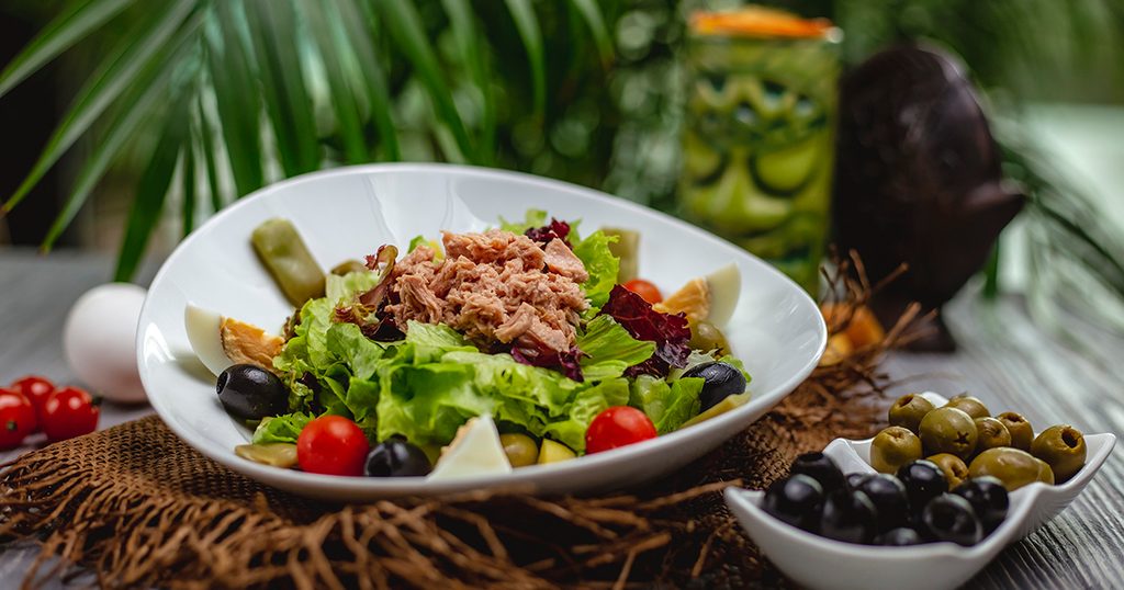 تحتوي سلطة التونة كمية وافرة من الخضار كالخسّ، الطماطم والخيار مع علبة واحدة من التونة. لا تقدموا سلطة التونة مع صلصة المايونيز كي تتجنبوا إضافة كمية كبيرة من السعرات الحرارية بل قدّموها مع عصير الليمون والزيت.